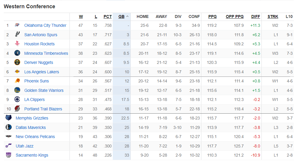 北京时间3月2日对于NBA来说是大比赛日,多场西部的比赛对西部的格局又出现了一些影响,比如森林狼击败掘金后已经豪取三连胜排名也升至西部第四,火箭还是西部第三,快船击败鹈鹕后再度升到西部第九。