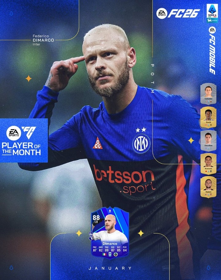 迪马尔科在一月份为国米出场5场意甲,贡献3球2助攻,其中对阵帕尔马、那不勒斯进球,对阵比萨单场1球2助攻。
